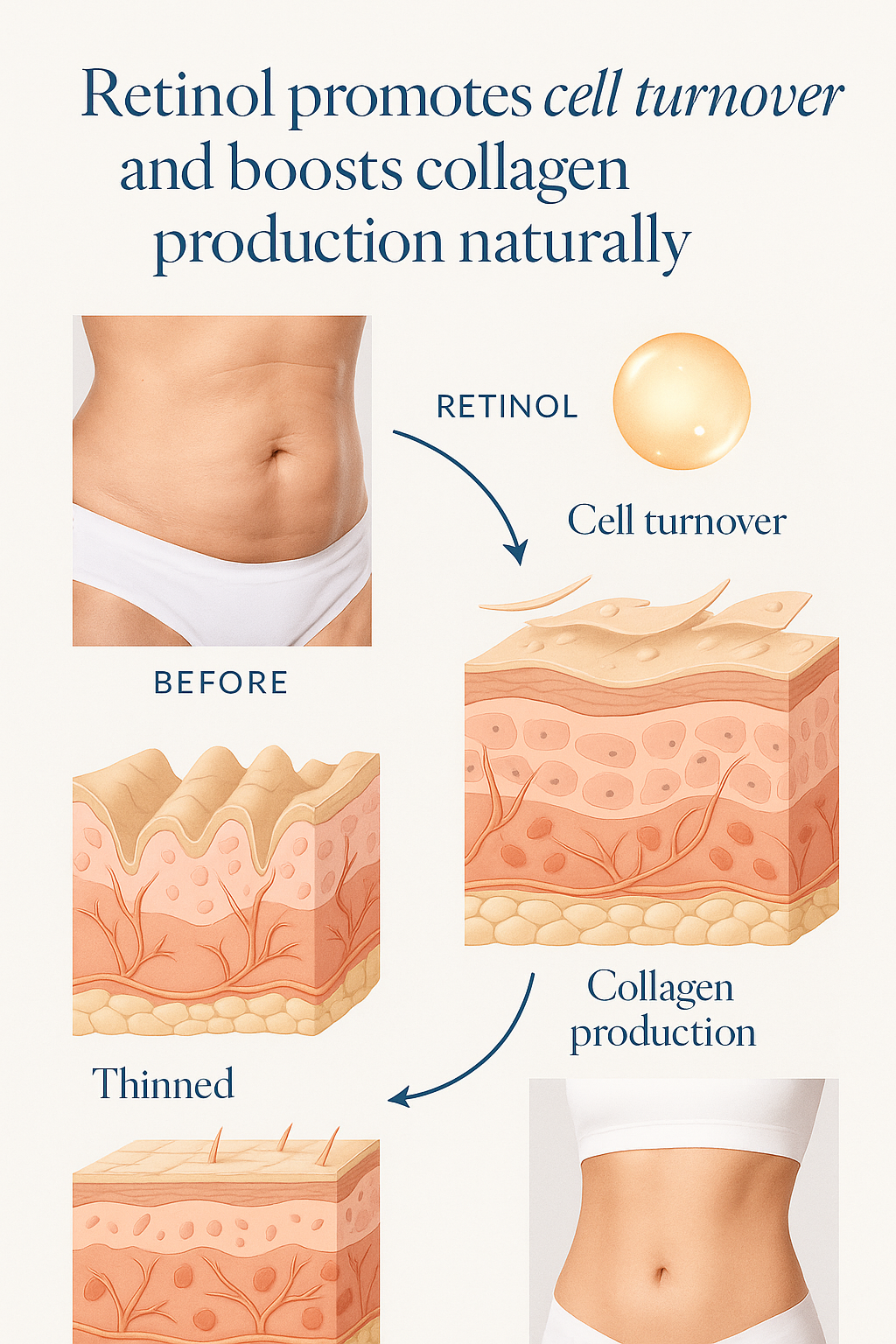 Retinol, a powerful derivative of vitamin A, has been clinically proven to stimulate fibroblasts to produce more collagen and elastin—two key proteins responsible for skin firmness and elasticity. As we age or undergo physical changes like childbirth or rapid weight loss, collagen levels drop, leading to sagging and wrinkles. By reactivating the skin’s natural cell turnover, retinol helps restore density, strengthen connective tissue, and visibly improve the tightness and resilience of the skin all over the body.