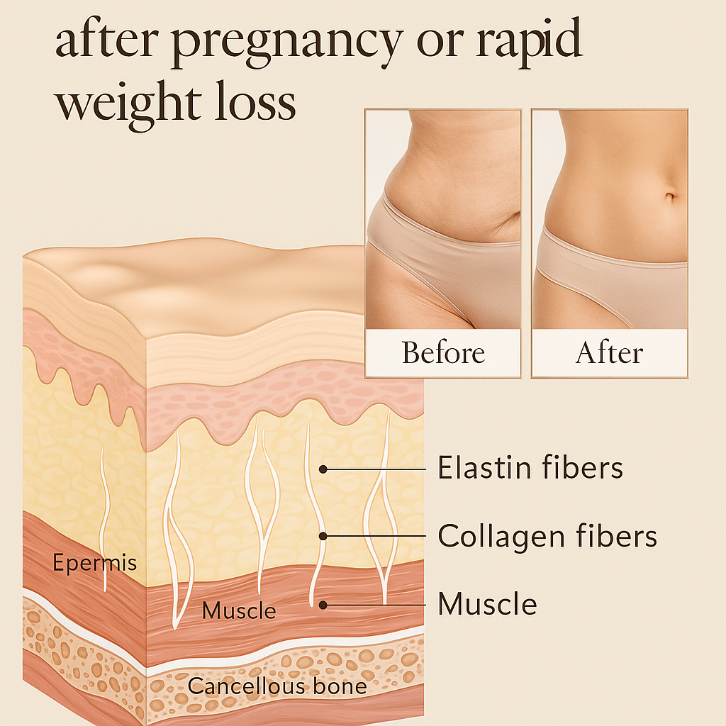 After childbirth or significant weight loss, the skin often struggles to retract, resulting in loose, crepey areas—especially around the abdomen, thighs, and arms. This product is specifically designed to support the repair of damaged collagen and elastin networks, restoring skin structure. When paired with consistent use and light massage, it helps re-tighten these areas and reduce visible sagging without invasive treatments like laser or surgery